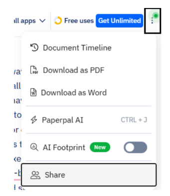 1. Paperpalオンラインエディタで、右上の三点リーダーをクリックし、「Share」を選択します。