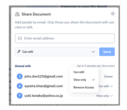 この共同編集機能はPaperpalユーザーに限定されません。Paperpalを利用していない人でも、メールアドレスさえあれば作業を共有し共同作業に招待できます。