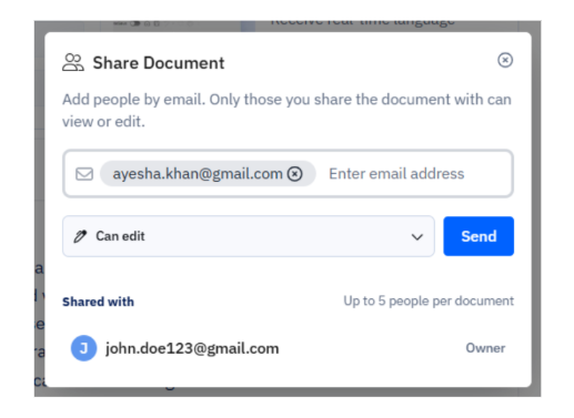 2. 共同編集者のメールアドレス(ドキュメントごとに最大5人まで)を入力し、アクセス権限(「View-only(閲覧のみ)」または「Edit(編集)」)を選択します。「Send」ボタンを押すと、共同編集者にドキュメントへの専用リンクが記載された通知メールが届きます。