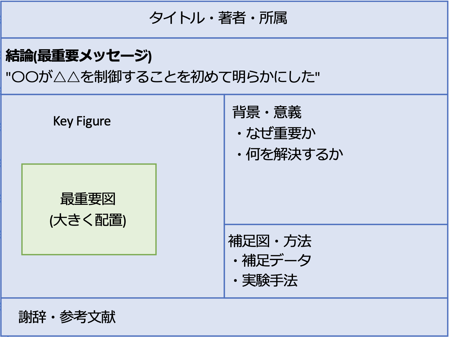 という問いに答えることで、タイトル・Key Figure・Conclusion の方向性が決まり、ポスター全体の中心軸が定まります。ここで書いた1文は、ポスター制作のすべてに影響するためとても重要です。
