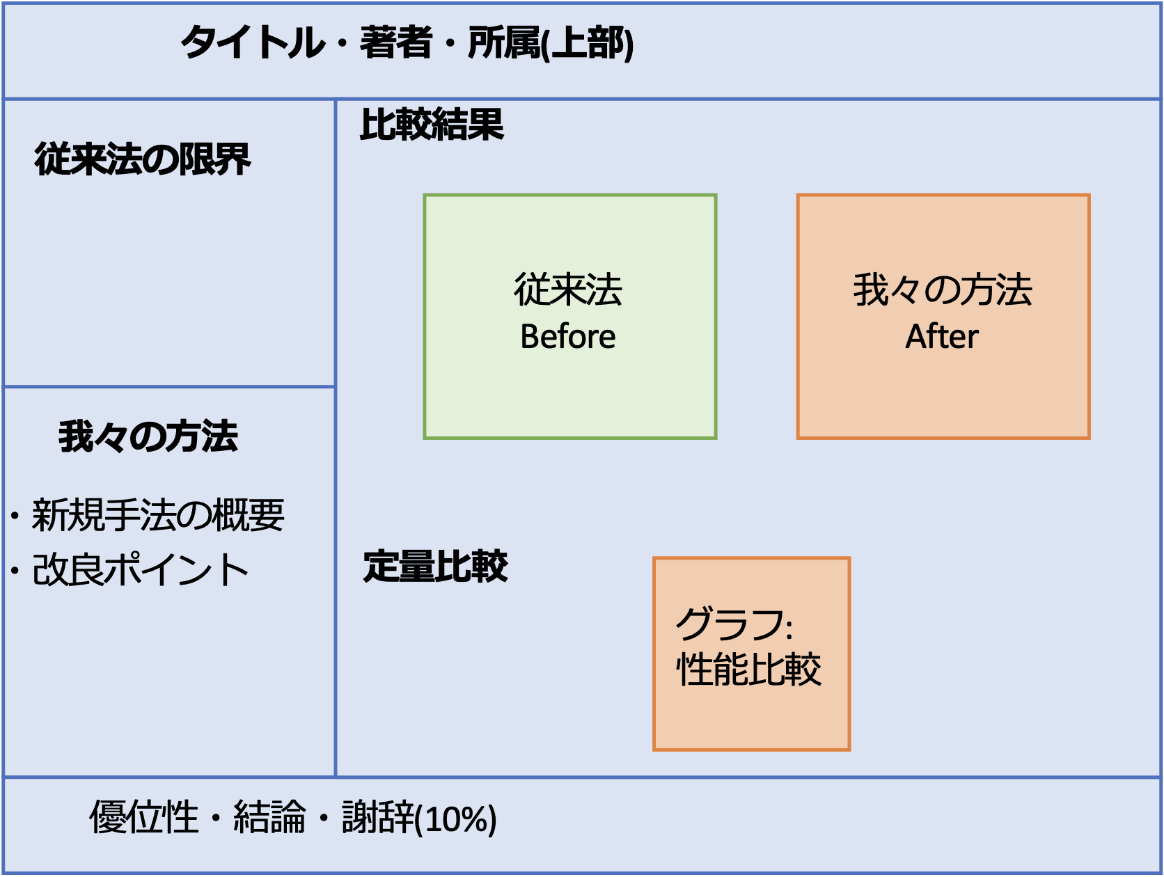 | 逆ピラミッド型 | 大規模学会、異分野向け | 従来型に慣れた人には違和感 |