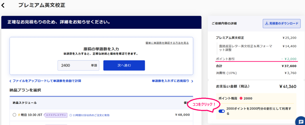 STEP 4:納品プラン選択後、「ご依頼内容の詳細」下「〇ポイントを割引として利用する」をクリック↓↓