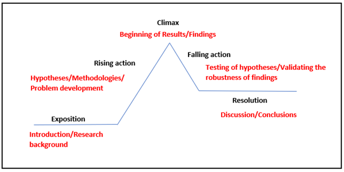 1. 序幕(Exposition): 研究論文では、これは研究のコンテキストを示す「序論(Introduction)」に相当します。研究の背景や既存研究の整理、そして解決すべき課題を提示することで、読者に「この研究はなぜ重要なのか」を理解させる役割を果たします。