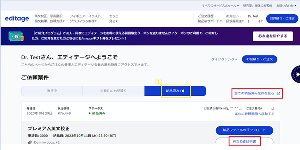 納品済の案件が表示されている場合、各案件の右側「英文校正証明書」ボタンからダウンロードできます。