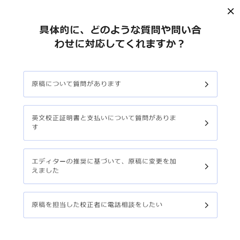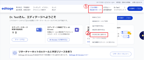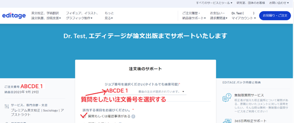マイアカウントメニュー内、【ご注文履歴・納品後サポート】> 【担当校正者に質問する】