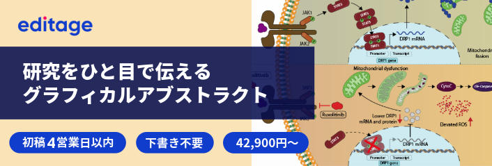 エディテージのグラフィカルアブストラクト制作サービスは、あなたの論文とターゲットジャーナルをお知らせいただくだけで、投稿ガイドラインに合わせたグラフィカルアブストラクトを制作しますので、イメージの制作が不慣れな方やお時間のない方、また研究発表後により多くの方の目に触れるようにしたい、と考えている方は、ぜひこの機会にサービスをご検討ください。