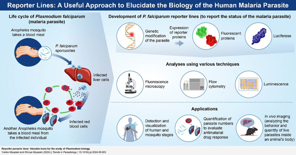 私たちはこれまでに、緑色蛍光タンパク質(GFP)やNanoLucなどのレポータータンパク質を発現する複数の遺伝子改変マラリア原虫を創出し、この研究分野をリードしてきました(参考文献1~3)。これらの研究を通じて得られた知見を基に、私たちは主に過去5年間に報告された遺伝子改変レポーターマラリア原虫を整理・概説した総説を発表しました。本総説は、寄生虫学に関心を持つ研究者や学生の方々を主な対象として執筆しており、本分野の現状と今後の展望を共有することを目的としています。
